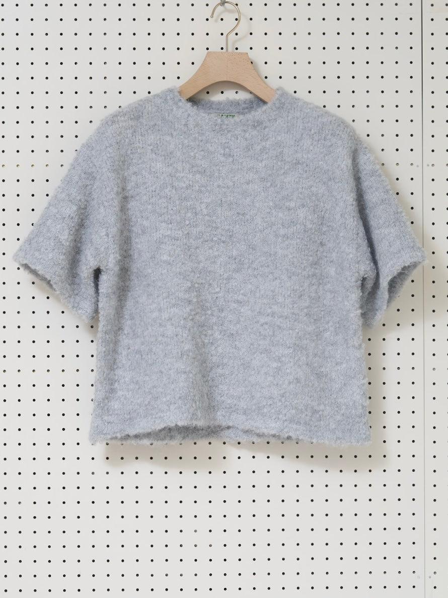 ふわっとしたブークレ糸で編んだTシャツ。 ボリュームがあるのでレイヤードしたり、着方を考えられます。 この糸は、スカイダイビングをしたときに空中で見た、空や雲の ような"ふわっ"を表現したく作りました。