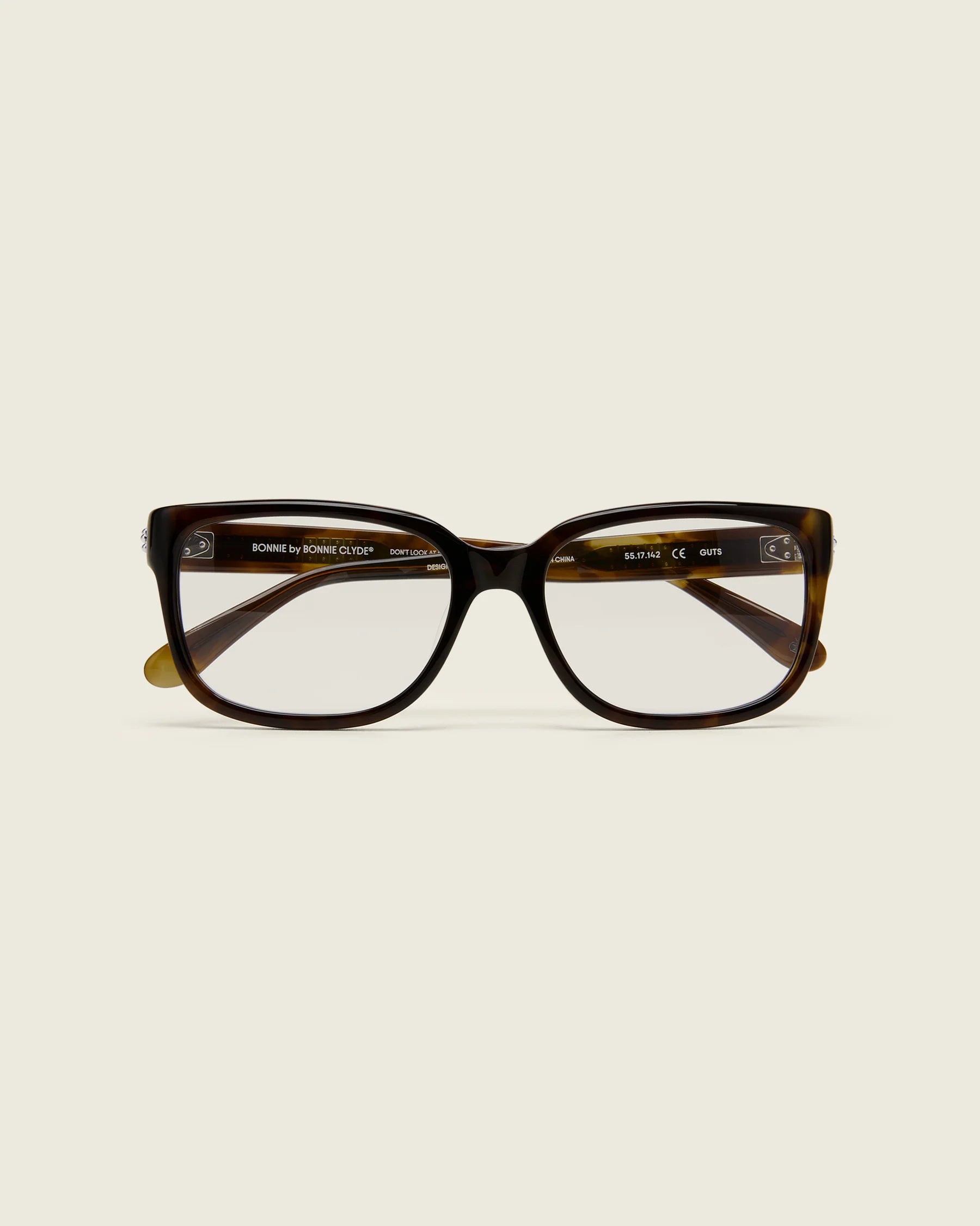Tortoise frames with clear lenses create a timeless yet contemporary look.
