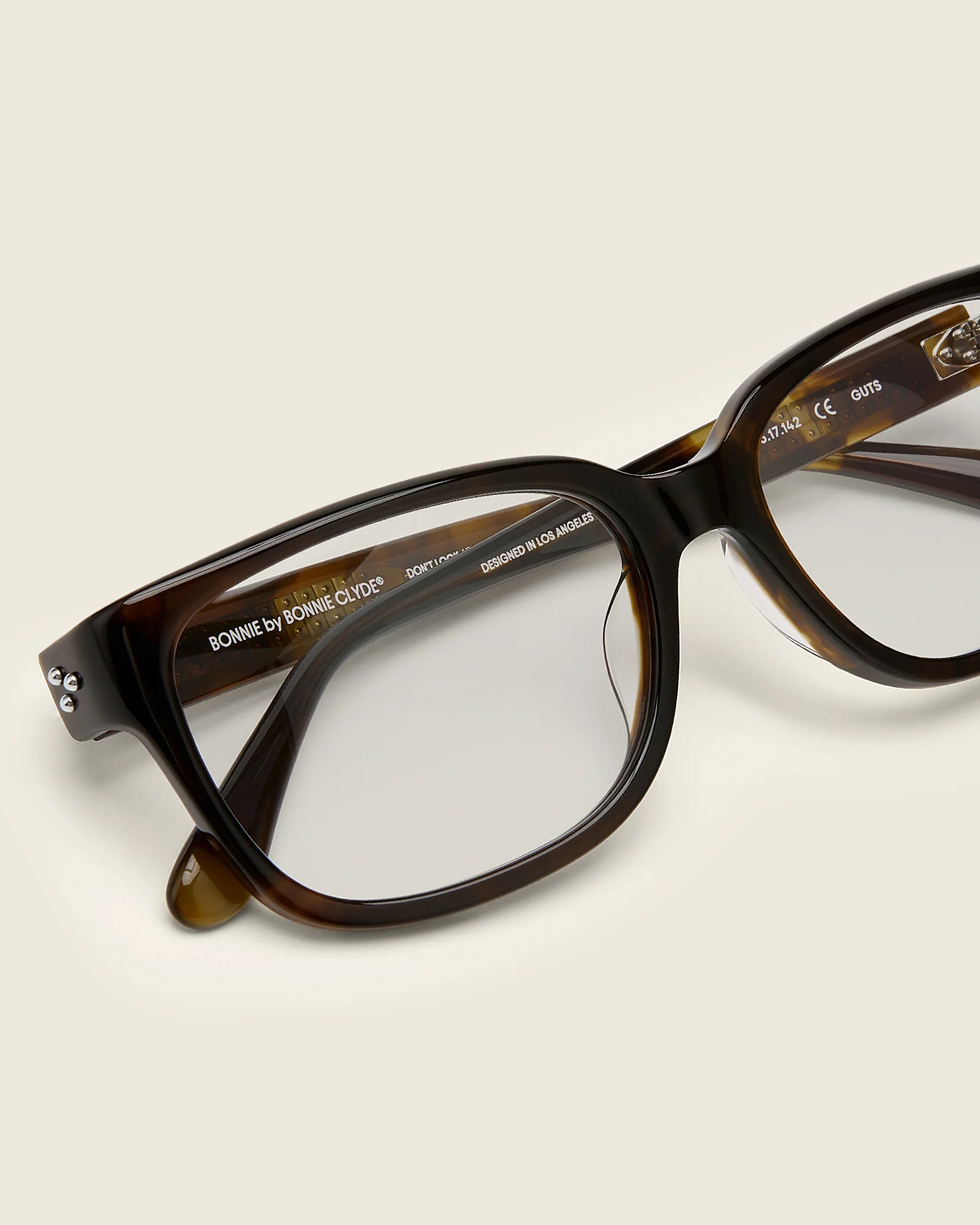 Bold, square-shaped acetate frames featuring thick temples with sculpted edges and mirrored triple metal bead detailing at the hinge. The statement silhouette offers both structure and sophistication.