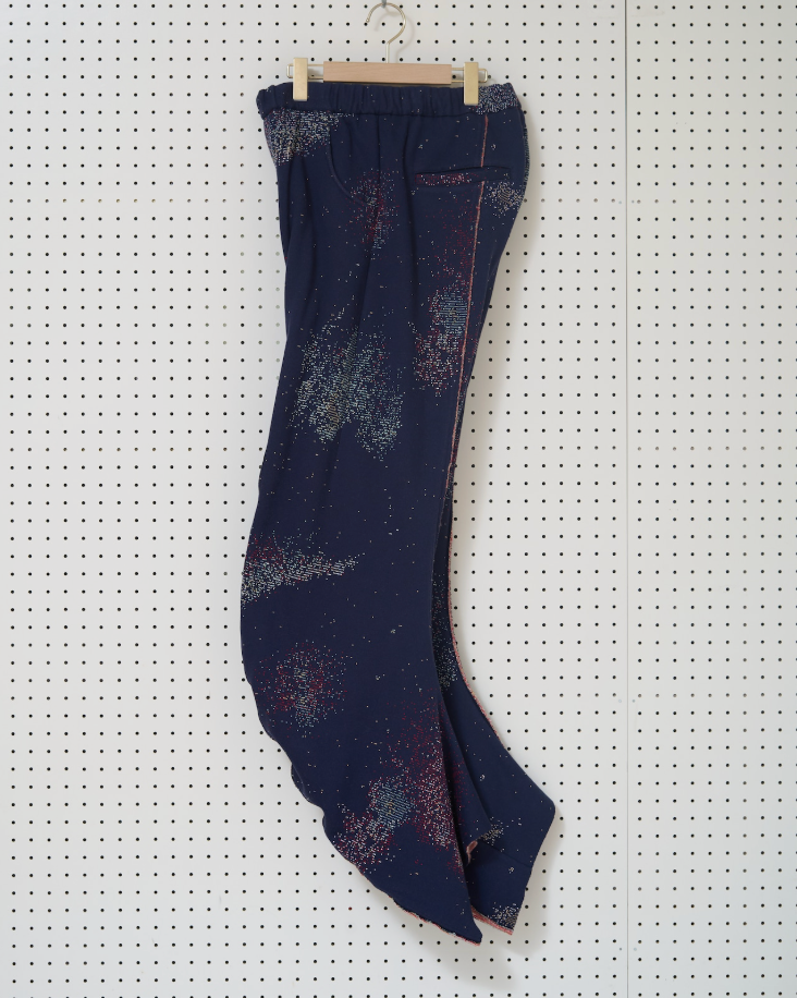 穿いてみると膝あたりから肌に沿って、渦を巻いてねじれるようなシルエットになります。